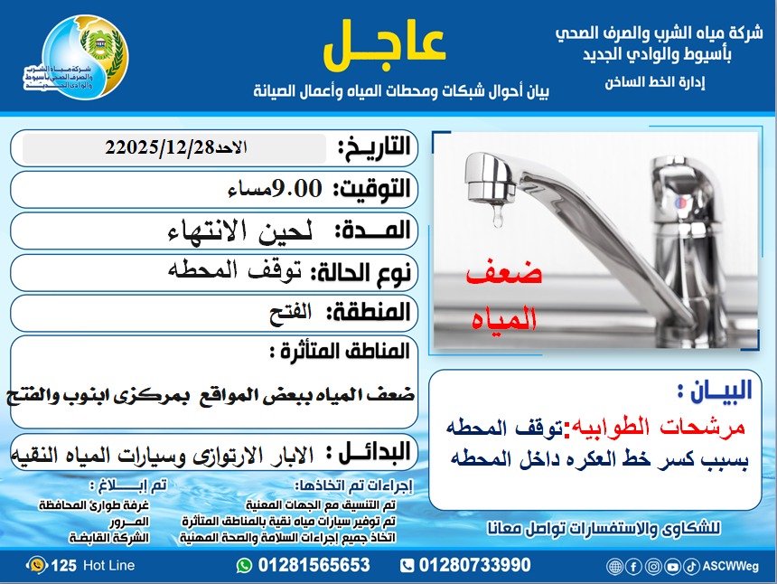 في إطار أعمال التوسعات بمحطة مياه أبوتيج المرشحة، تعلن شركة مياه الشرب والصرف الصحي بأسيوط و