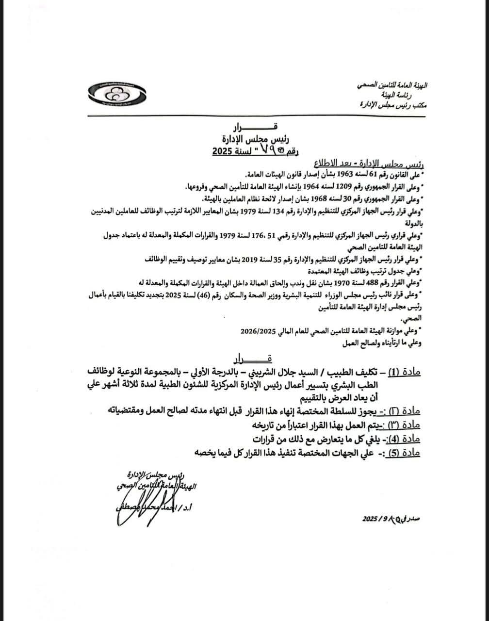 اصدر الدكتور أحمد مصطفى رئيس الهيئة العامة للتأمين الصحي قرارا بتعيين الدكتور السيد جلال الشربينى ر