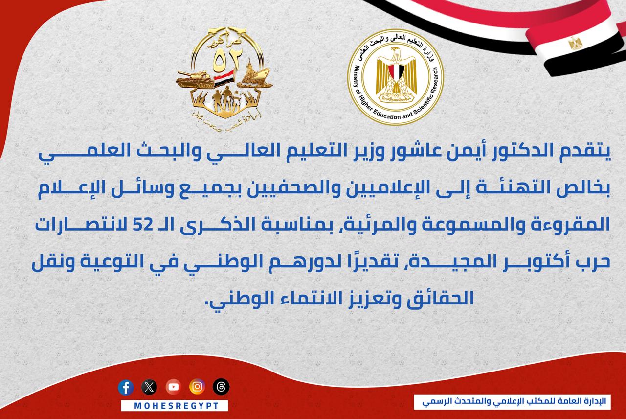 يتقدم الدكتور أيمن عاشور وزير التعليم العالي والبحث العلمي، بخالص التهنئة إلى الإعلاميين والصحفيين
