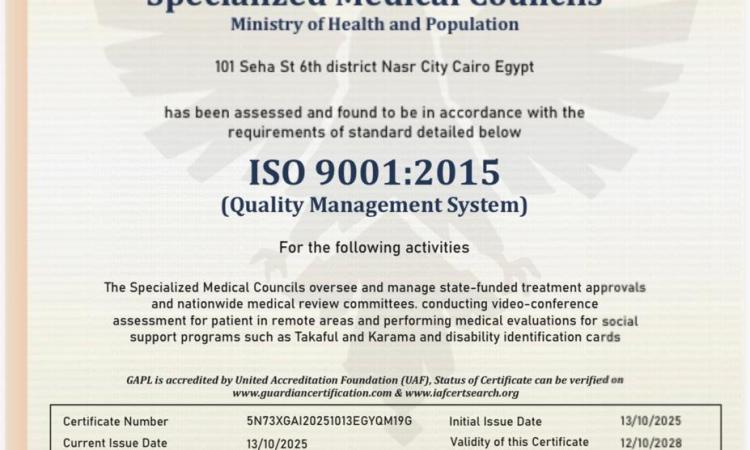 الصحة: "المجالس الطبية" تحصل على شهادة الاعتماد الدولي لنظام إدارة الجودة