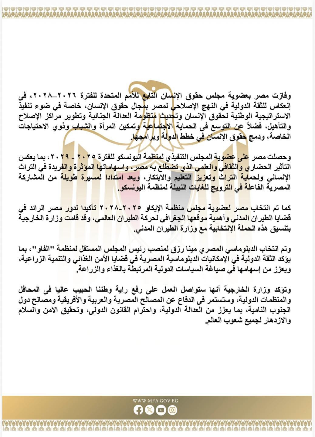 وفازت مصر بعضوية مجلس حقوق الإنسان التابع للأمم المتحدة للفترة 2026–2028، فى إنعكاس للثقة الدولية في النهج الإصلاحي لمصر بمجال حقوق الإنسان، خاصة في ضوء تنفيذ الاستراتيجية الوطنية لحقوق الإنسان وتحديث منظومة العدالة الجنائية وتطوير مراكز الإصلاح والتأهيل، فضلاً عن التوسع فى الحماية الاجتماعية وتمكين المرأة والشباب وذوي الاحتياجات الخاصة، ودمج حقوق الإنسان في خطط الدولة وبرامجها.