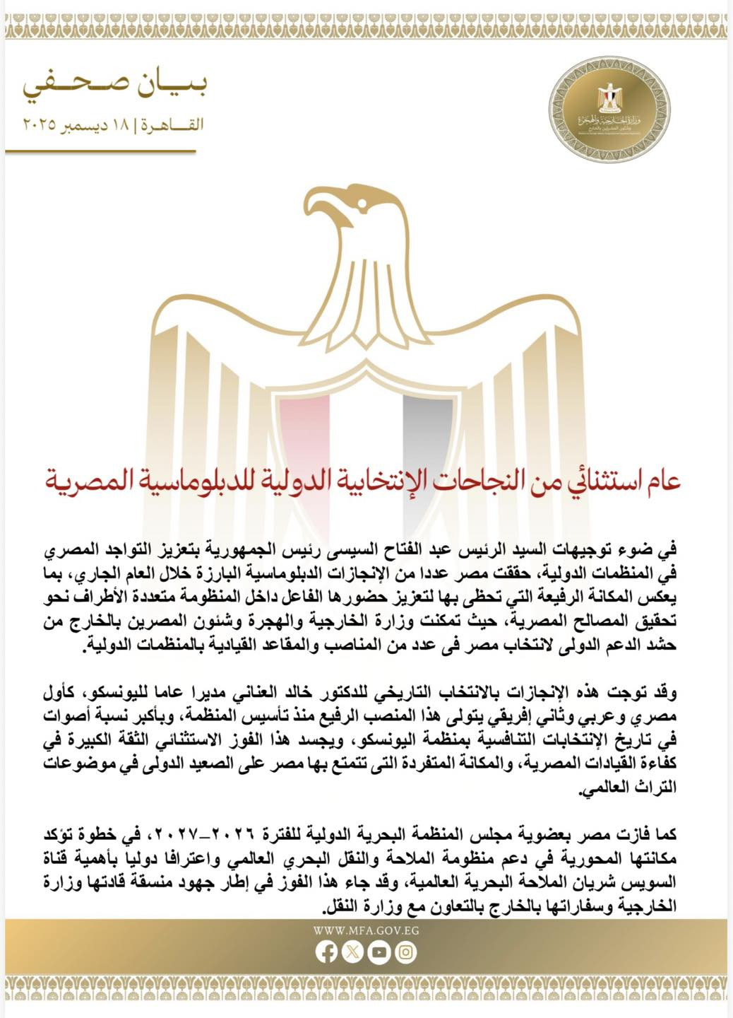 وتؤكد وزارة الخارجية أنها ستواصل العمل على رفع راية وطننا الحبيب عاليا فى المحافل والمنظمات الدولية، وستستمر فى الدفاع عن المصالح المصرية والعربية والأفريقية ومصالح دول الجنوب النامية، بما يعزز من العدالة الدولية، واحترام القانون الدولى، وتحقيق الامن والسلام والازدهار لجميع شعوب العالم.