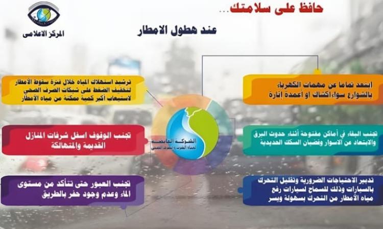 تناشد الشركة القابضة لمياه الشرب والصرف الصحي المواطنين اتباع إرشادات هامة خلال فترات سقوط الأمطار الغزيرة، تجنبًا لحدوث أية أضرار.