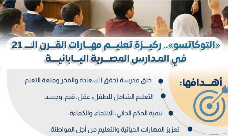 استعرض مركز المعلومات ودعم اتخاذ القرار بمجلس الوزراء، عبر سلسلة من الإنفوجراف، جهود الدولة في إطار اهتمامها بتطوير منظومة التعليم وبناء أجيال قادرة على مواكبة متطلبات المستقبل، من خلال تجربة "المدارس المصرية اليابانية"، باعتبارها أحد النماذج التعليمية الحديثة التي تطبق فلسفة تعليمية شاملة، تستند إلى أنشطة "التوكاتسو"، الهادفة إلى تنمية شخصية الطالب المصري بصورة متكاملة.