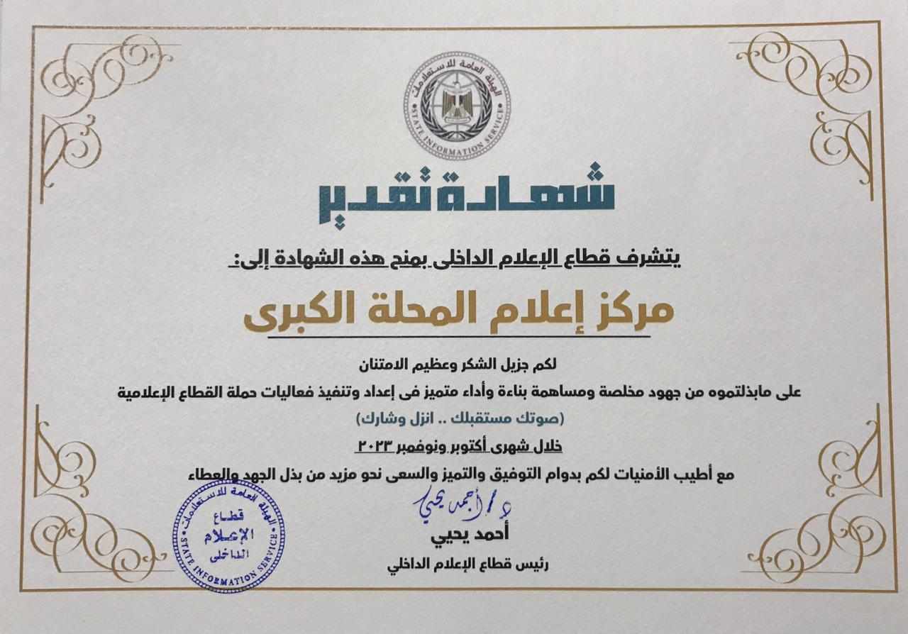 كرمت الهيئة العامة للاستعلامات مركز إعلام المحلة الكبرى صباح اليوم بمقر الهيئة فى القاهرة بعد الأداء المشرف للمركز في حملة " انزل شارك"