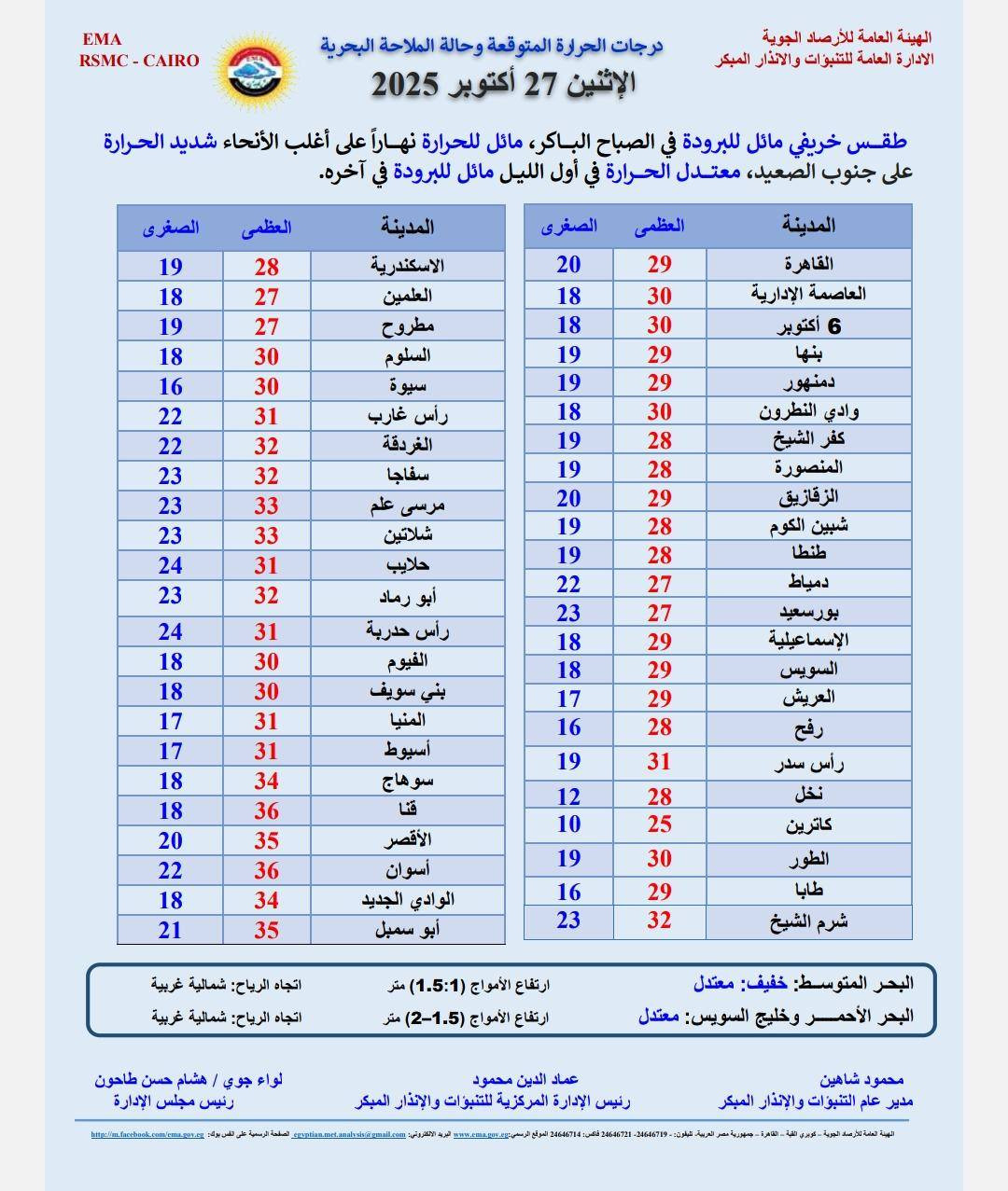 أعلنت الهيئة العامة للأرصاد الجوية عن توقعاتها لحالة الطقس اليوم الإثنين الموافق 27 أكتوبر 2025، مشيرة إلى أن الطقس سيكون خريفياً مائلاً للبرودة في الصباح الباكر، حاراً نهاراً على أغلب الأنحاء، مائلاً للحرارة على السواحل الشمالية، وشديد الحرارة على جنوب الصعيد. أما ليلاً، فيكون الطقس معتدل الحرارة في أول الليل مائل للبرودة في آخره.