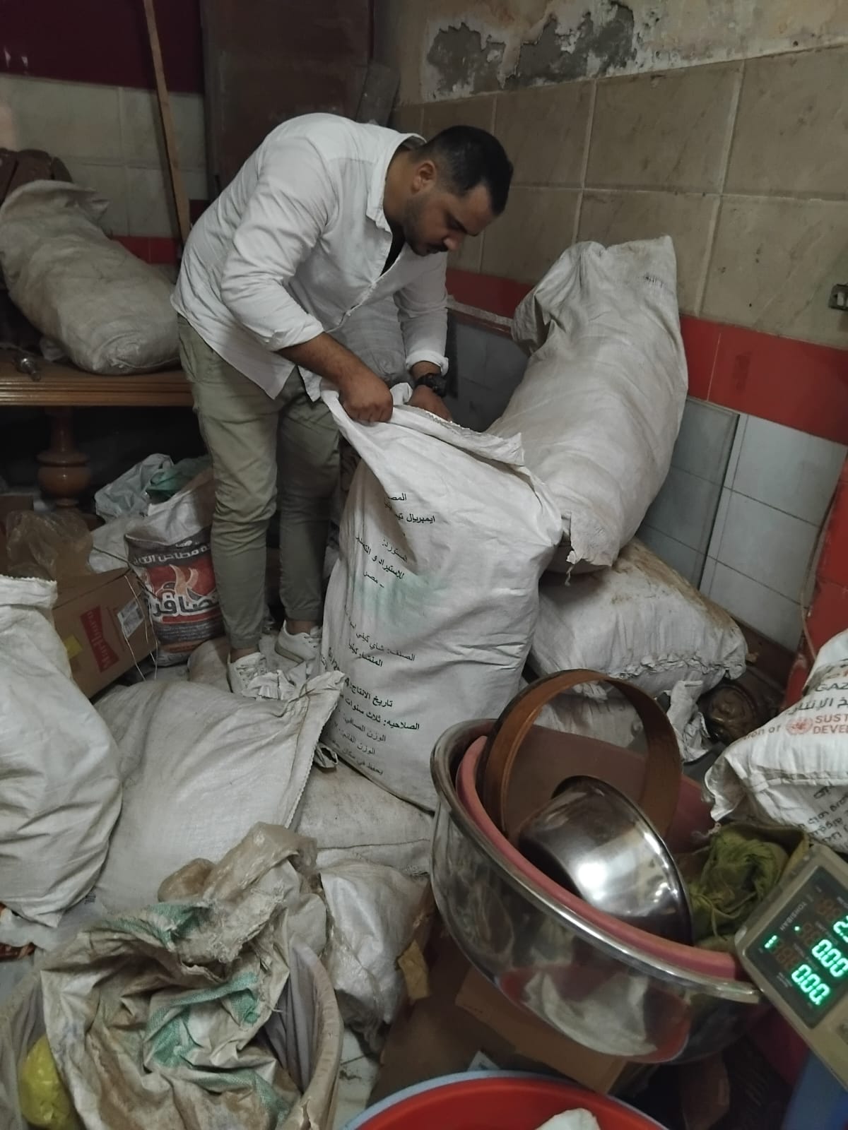 كما تم ضبط محل أعلاف يحوز بدون فواتير و ٤٠ شكارة أرز أبيض فاخر وزن الشيكارة ١٠ كجم إجمالي ٤٠٠ كجم