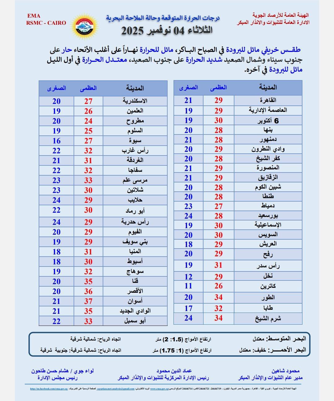 تتوقع الهيئة العامة للأرصاد الجوية، أن يشهد اليوم الثلاثاء، طقس خريفي مائل للبرودة في الصباح الباكر، مائل للحرارة نهارا على أغلب الأنحاء حار على جنوب سيناء وشمال الصعيد شديد الحرارة على جنوب الصعيد، معتدل الحرارة في أول الليل مائل للبرودة في آخره.