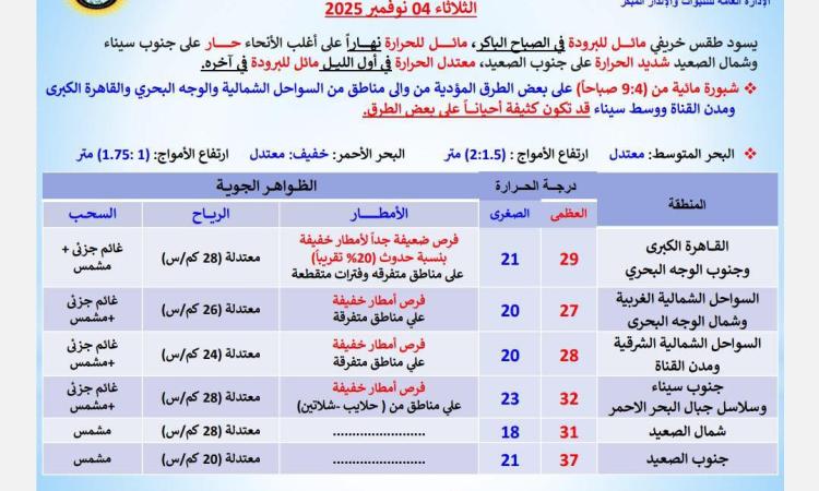 ويشهد الطقس فرص أمطار خفيفة على مناطق من السواحل الشمالية وشمال الوجه البحري ومدن القناة وجنوباً على حلايب - شلاتين على فترات متقطعة.