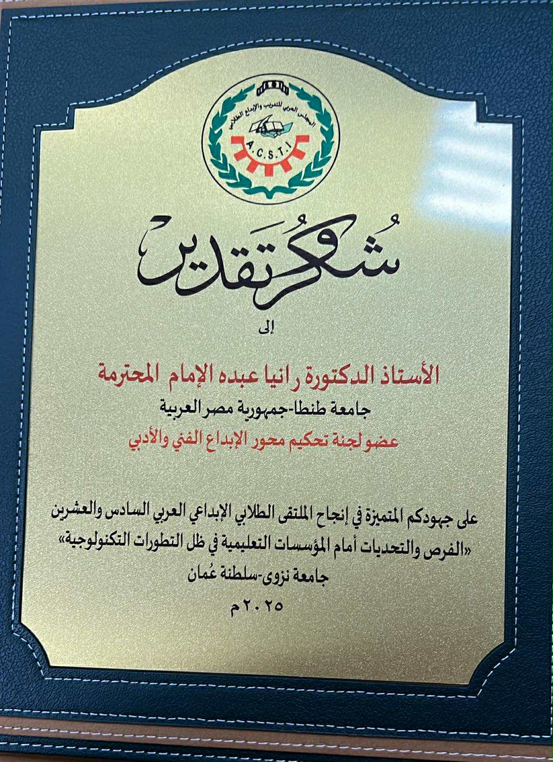 كرم الملتقى الملتقى الطلابي الإبداعي العربي السادس والعشرين الدكتورة رانيا عبده الإمام عميد كلية التربية النوعية بجامعة طنطا علي هامش فعاليات المؤتمر نظرا لتميزها "محكما في محور الإبداع الفني والأدبي ضمن فعاليات الملتقى"