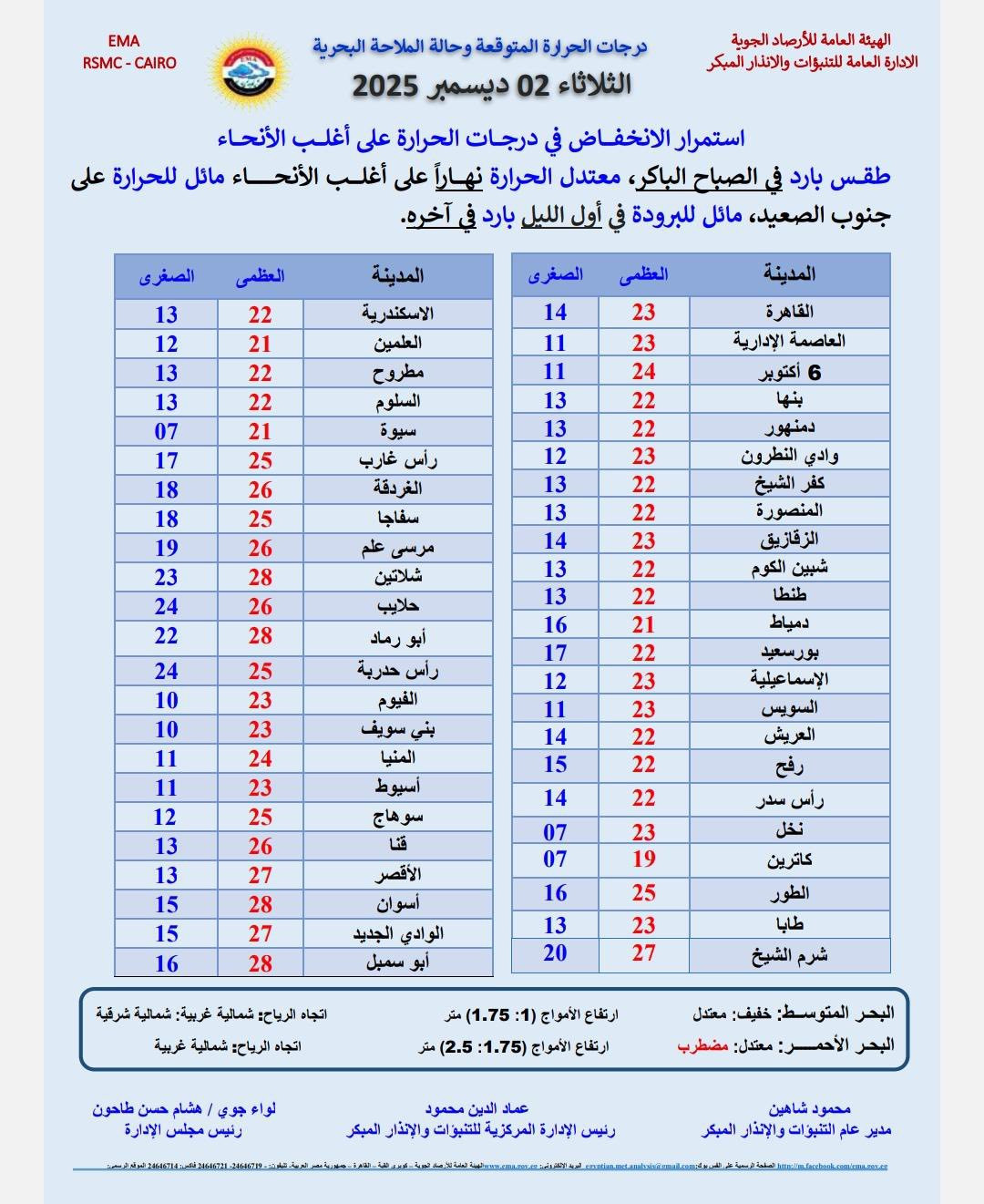 وفيما يلي بيان بدرجات الحرارة المتوقعة اليوم على مدن ومحافظات مصر: