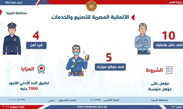 وأوضحت الوزارة أن هذه الفرص تأتي استكمالا لخطة الدولة في دعم ملف التشغيل وخلق فرص عمل حقيقية داخل بيئات عمل آمنة ومناسبة، مع المتابعة المستمرة لتطبيق الحد الأدنى للأجور وكافة اشتراطات ومعايير العمل.