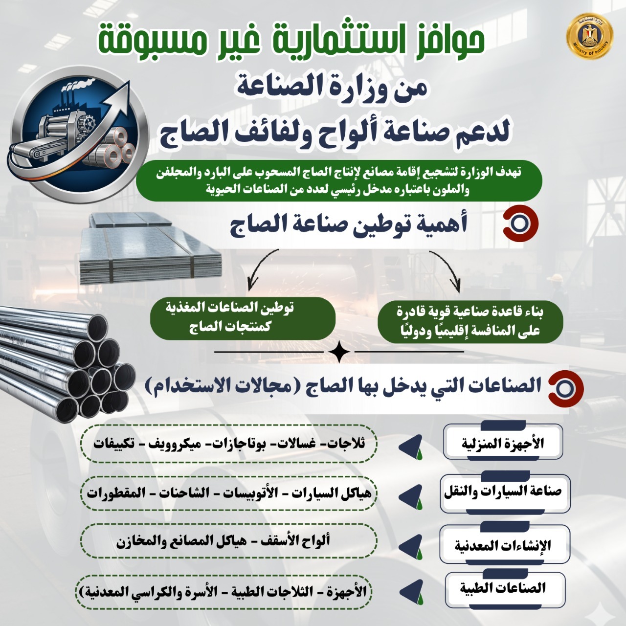 وتأتي الحوافز الجديدة في إطار رؤية وزارة الصناعة لبناء قاعدة صناعية قوية قادرة على المنافسة إقليميًا ودوليًا، وتوطين الصناعات المغذية كمنتجات الصاج التي تدخل في مجموعة واسعة من الصناعات أبرزها الأجهزة المنزلية (الثلاجات، الغسالات، البوتاجازات، الميكروويف، التكييفات) وصناعة السيارات ووسائل النقل (هياكل السيارات، الأتوبيسات، الشاحنات، المقطورات) والصناعات الطبية (الأجهزة، الثلاجات الطبية، الأسرة والكراسي المعدنية) والتعبئة والتغليف المعدنية (علب الأغذية والمشروبات) والإنشاءات المعدنية (ألواح الأسقف، هياكل المصانع والمخازن)، والمعدات الزراعية (الجرارات، الصوب الزراعية، أدوات الحصاد)، والأثاث المعدني والتجهيزات المكتبية والمنزلية.