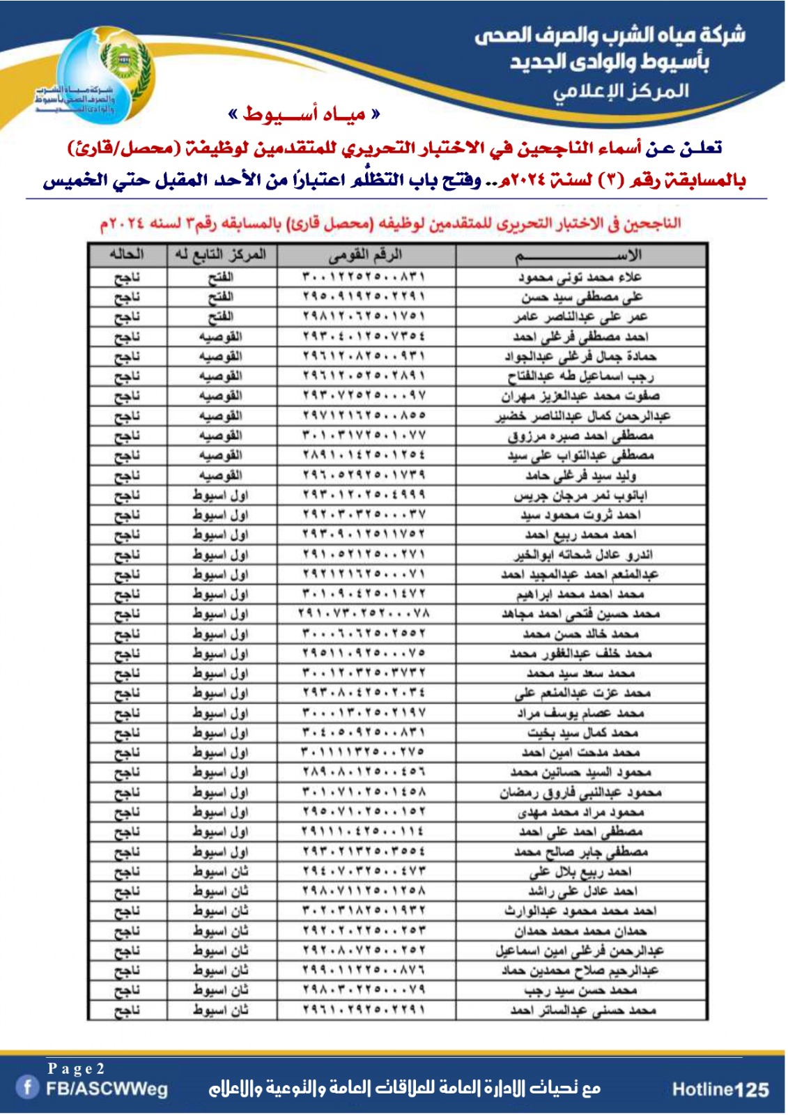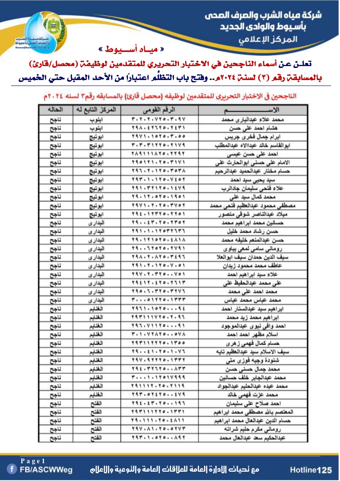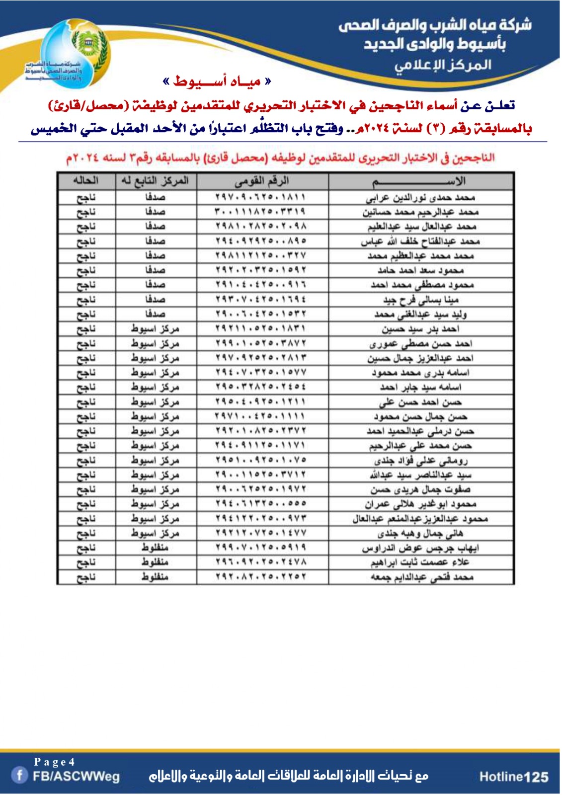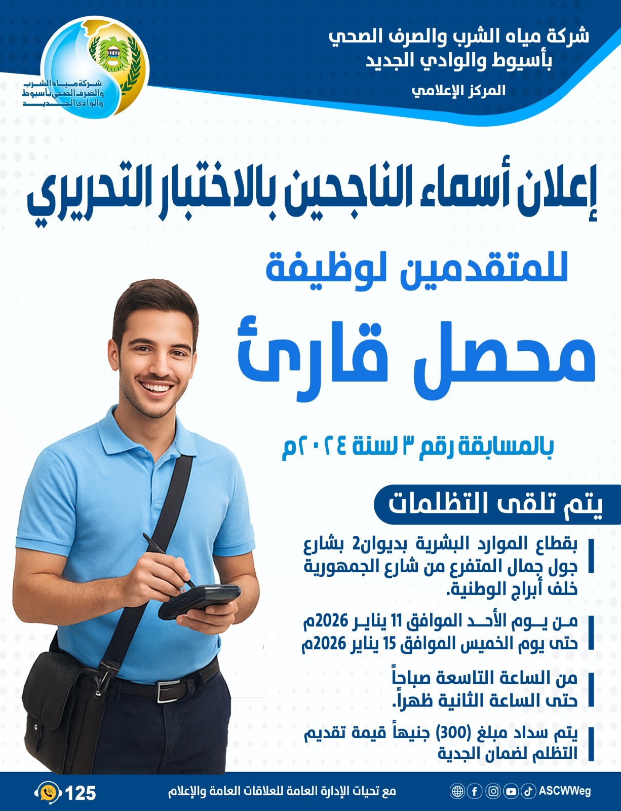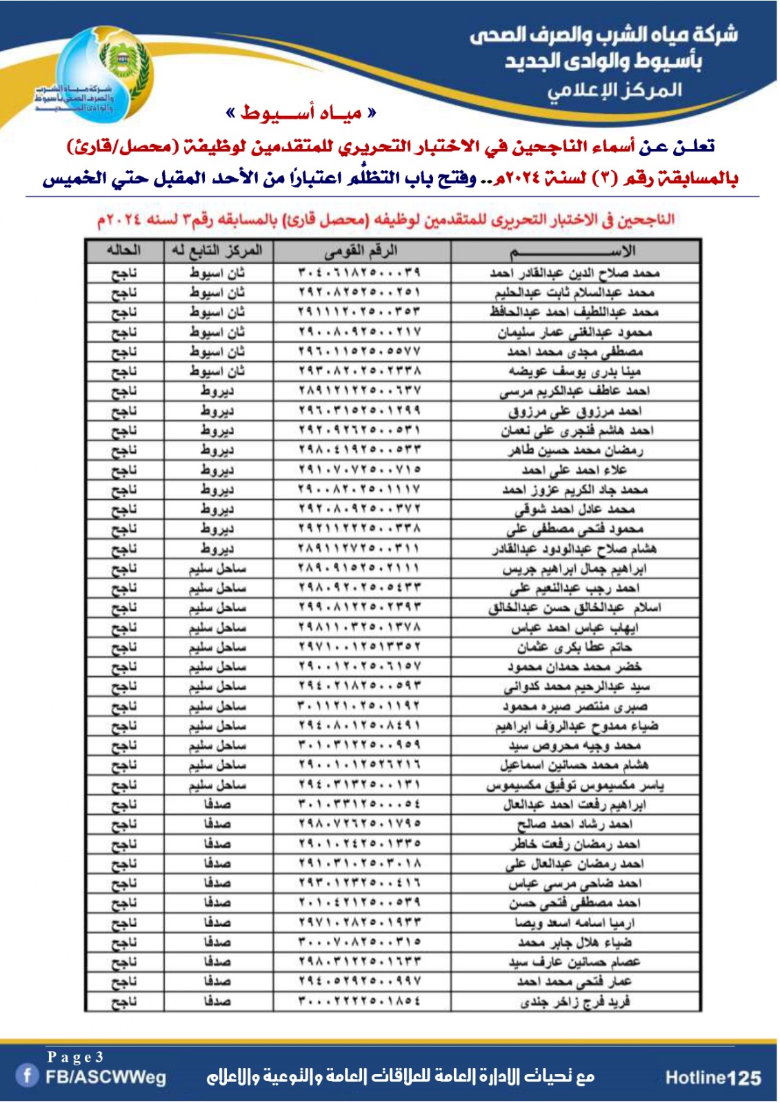 تعلن شركة مياه الشرب والصرف الصحي بأسيوط والوادي الجديد، عن أسماء الناجحين في الاختبار التحريري للمتقدمين لوظيفة (محصل/قارئ) بنظام التعاقد للذين ينطبق عليهم الشروط بالمسابقة رقم (3) لسنة 2024 م التي سبق الإعلان عنهم بالصفحة الرسمية والموقع الرسمي للشركة التي اجريت بتاريخ 1 نوفمبر 2025م بقاعات كلية التجارة بجامعه اسيوط .