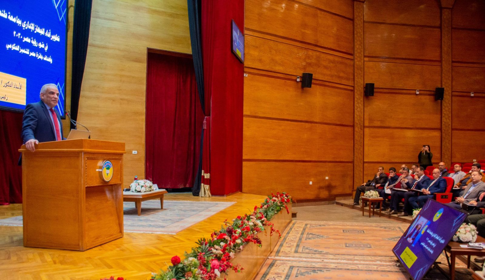 استهلّ الأستاذ الدكتور محمد حسين عرضه التقديمي بتوضيح أن الأداء الإداري في الجامعات الحكومية المصرية شهد تحولًا جذريًا مدفوعًا بمستهدفات رؤية مصر 2030، وذلك من خلال رؤية ثاقبة للقيادة السياسية في تطوير منظومات التعليم العالي والبحث العلمي لمواكبة الاحتياجات التنموية على المستويين المحلي والقومي، حيث نجحت الجامعات في استبدال النظم التقليدية بمنظومات رقمية متكاملة عززت قيم الشفافية والكفاءة.