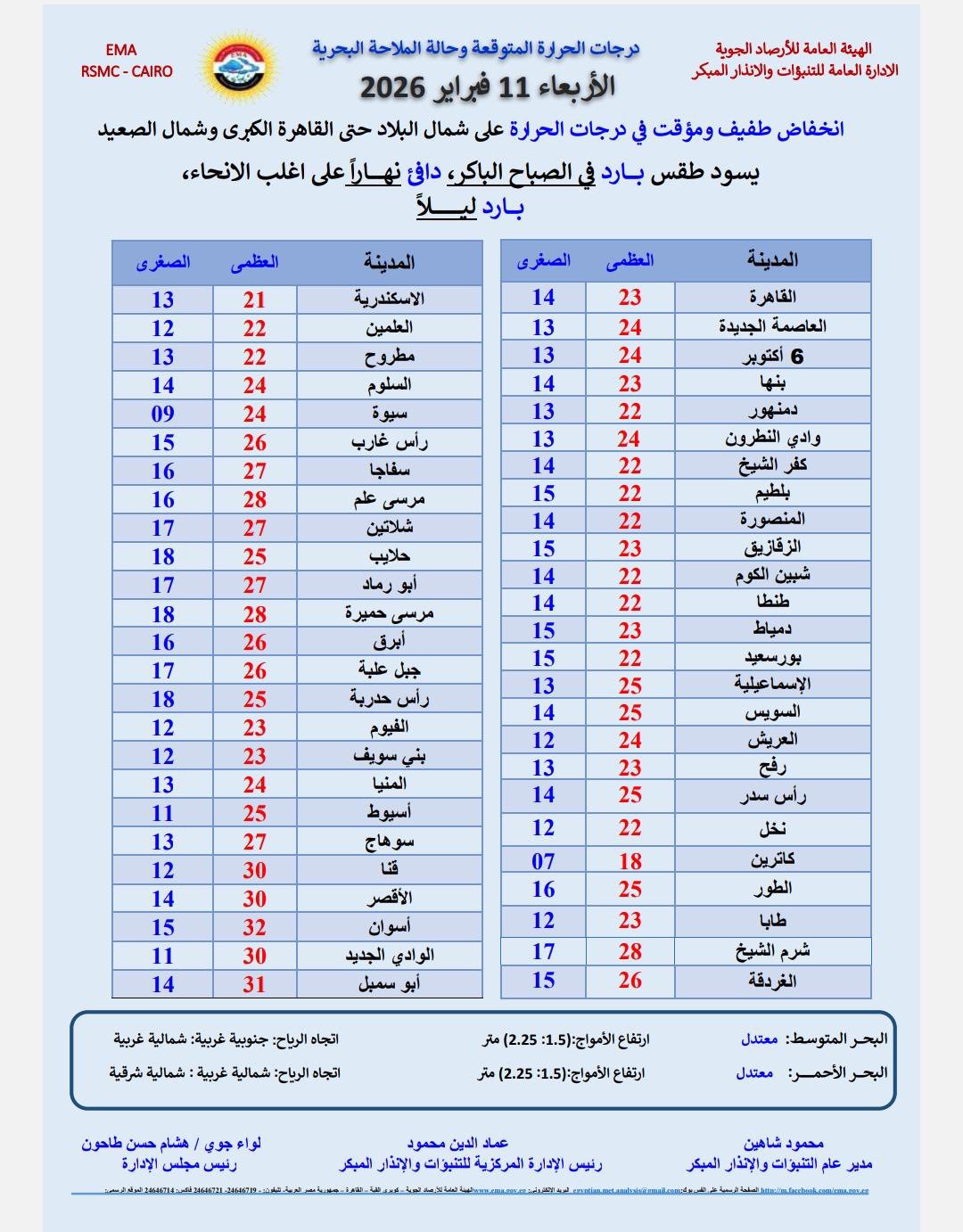 وفيما يلي بيان بدرجات الحرارة المتوقعة اليوم على مدن ومحافظات مصر: