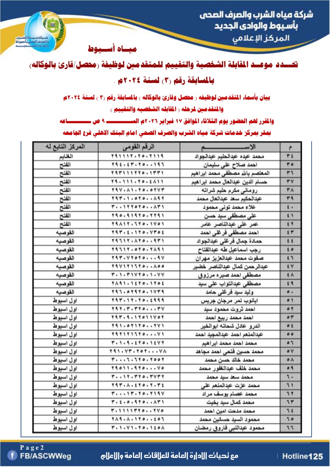 ونوه سيادته إلى ضرورة حضور السادة المتقدمين الذين اجتازوا الاختبار التحريري في تمام الساعة التاسعة صباحًا يوم الثلاثاء الموافق 17 فبراير 2026م، وذلك بمقر مركز خدمات شركة مياه الشرب والصرف الصحي أمام البنك الأهلي _ فرع جامعة أسيوط، لإجراء المقابلة الشخصية والتقييم، طبقًا للكشوف المعلنة.