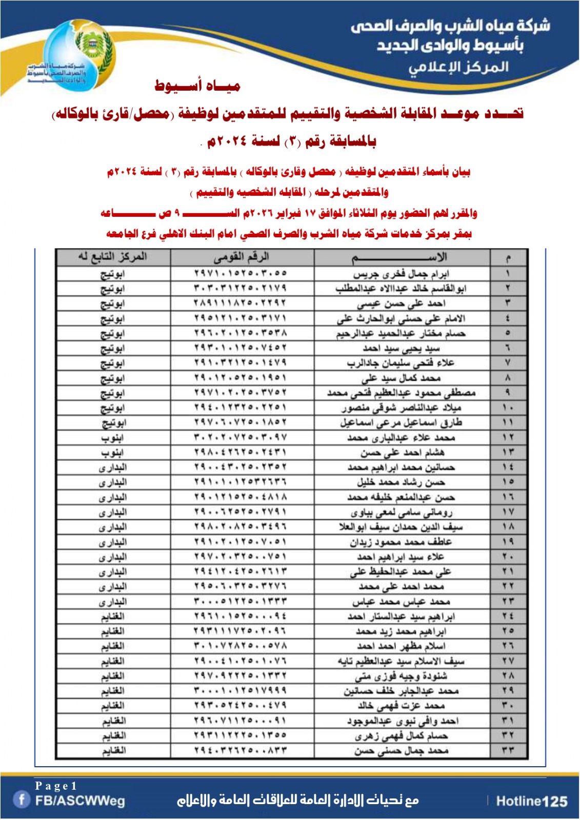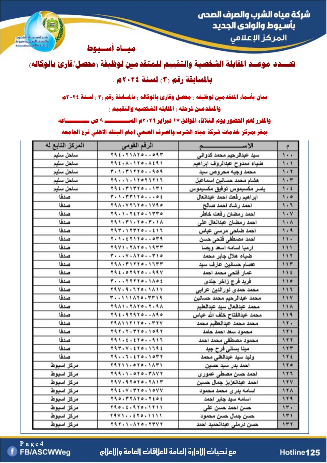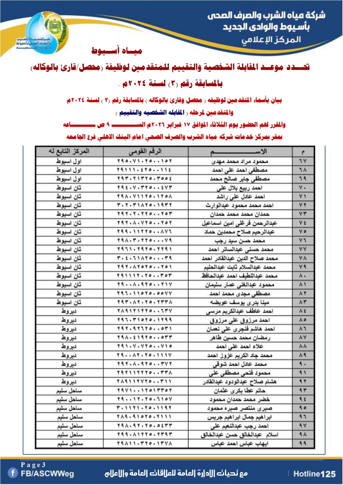 تعلن شركة مياه الشرب والصرف الصحي بأسيوط والوادي الجديد عن تحديد موعد المقابلة الشخصية والتقييم للمتقدمين لوظيفة  (محصل/قارئ بالوكاله)  بالمسابقة رقم (3) لعام 2024م ، والذين تم قبول تظلمهم من نتيجة الاختبار التحريري والذين اجتازوا الاختبار التحرير والذي سبق الإعلان عنهم بالصفحة الرسمية والموقع الرسمي للشركة التي اجريت بتاريخ  1 نوفمبر 2025م بقاعات كلية التجارة بجامعه اسيوط .