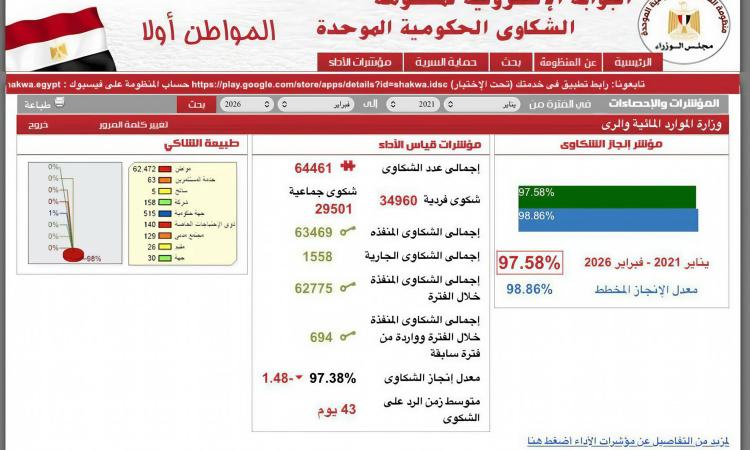 جدير بالذكر أن مؤشر إنجاز الشكاوى بوزارة الموارد المائية والرى بمنظومة الشكاوى الحكومية الموحدة بمجلس الوزراء أوضح أن الوزارة قامت ببحث ودراسة عدد (1192) شكوي وطلب وإستغاثة خلال شهر فبراير 2026 ، وأن نسبة حسم الشكاوى خلال الفترة من يناير 2021 حتى نهاية شهر فبراير 2026 بلغت ( 97.6%) .
