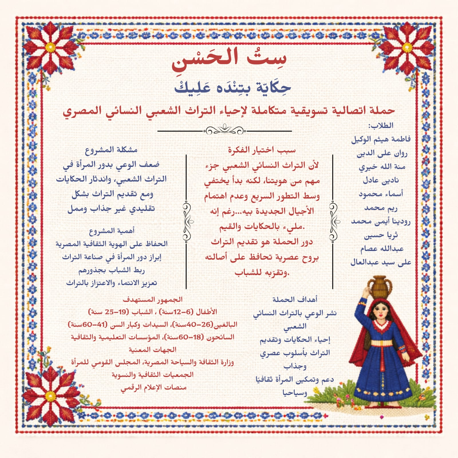 ينطلق المشروع الذي أعده مجموعة من طلاب السنة النهائية قسم العلاقات العامة والإعلان جامعة مصر للعلوم والتكنولوجيا ينطلق من فكرة أن التراث النسائي لم يكن يومًا مجرد تفاصيل هامشية، بل كان وسيلة المجتمع لفهم نفسه؛ فالمرأة المصرية كانت الحكاءة الأولى، والمغنية الأولى، وناقلة العادات والتقاليد عبر الزمن، بداية من الأسطورة وصولًا إلى الثقافة الشعبية الحديثة.