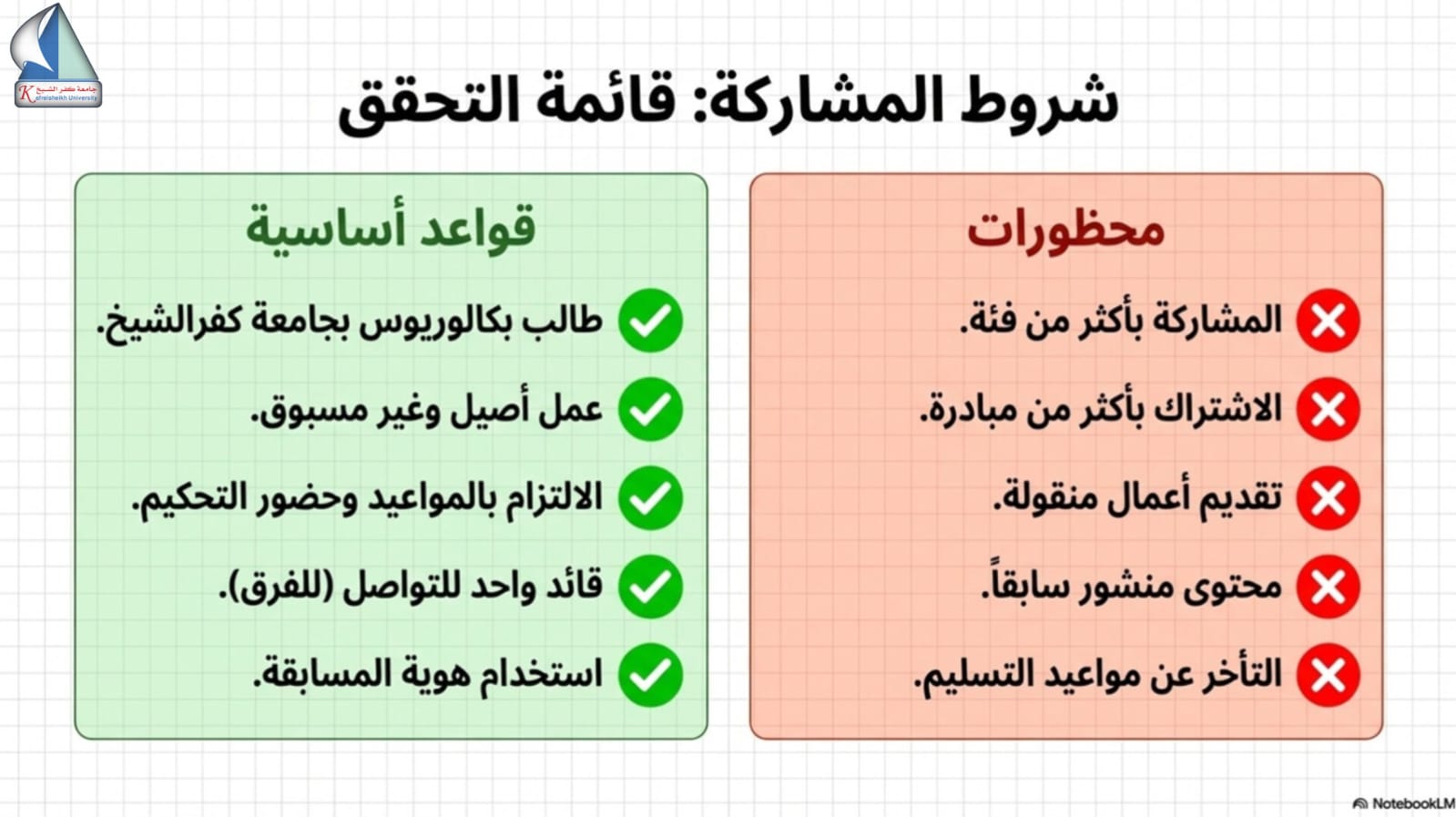 أن يكون الطالب مقيدًا بمرحلة البكالوريوس، المشاركة في فئة واحدة فقط، أن يكون العمل أصليًا وغير منشور مسبقًا، والالتزام بالمواعيد المحددة لكل مرحلة.