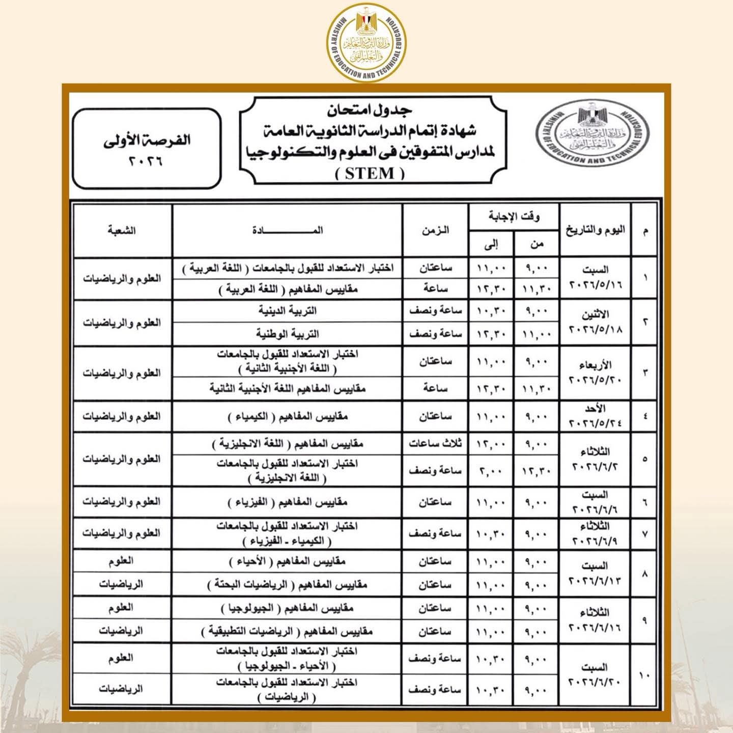 كما تبدأ امتحانات شهادة إتمام الثانوية العامة بمدارس المتفوقين في العلوم والتكنولوجيا "STEM” (الفرصة الأولى) يوم 16 مايو 2026 وتنتهي يوم 20 يونيو 2026، وتبدأ امتحانات (الفرصة الثانية) يوم السبت 4 يوليو 2026 وتنتهي يوم 22 يوليو 2026.